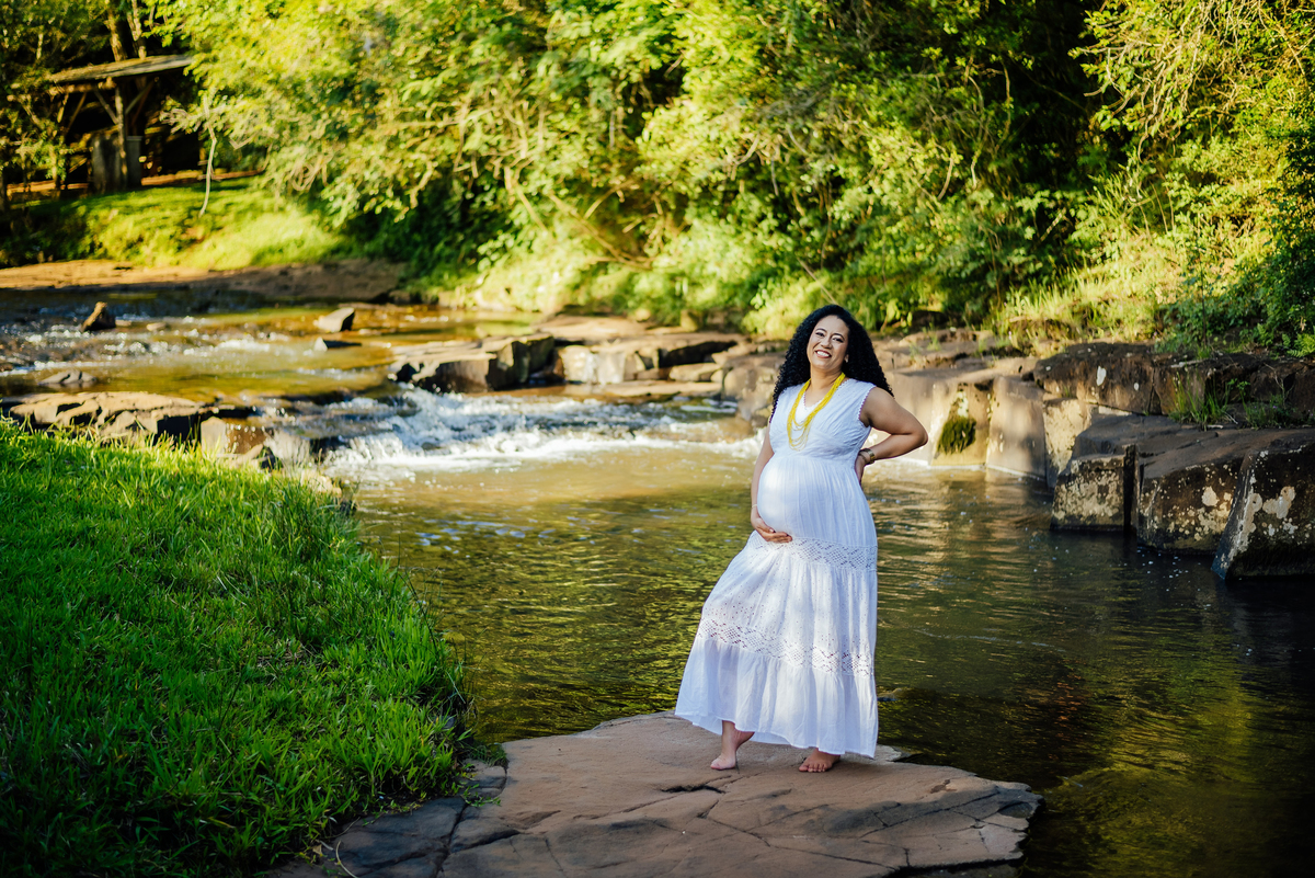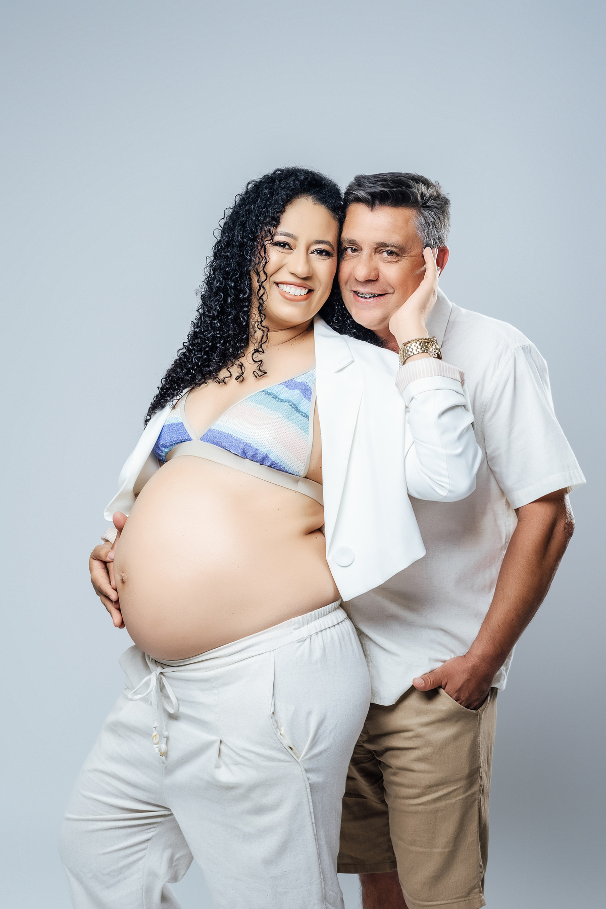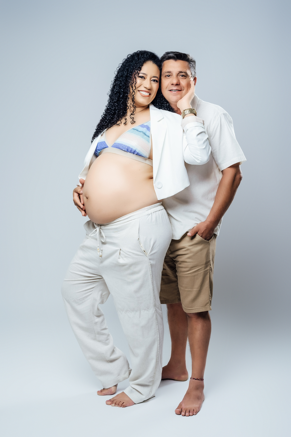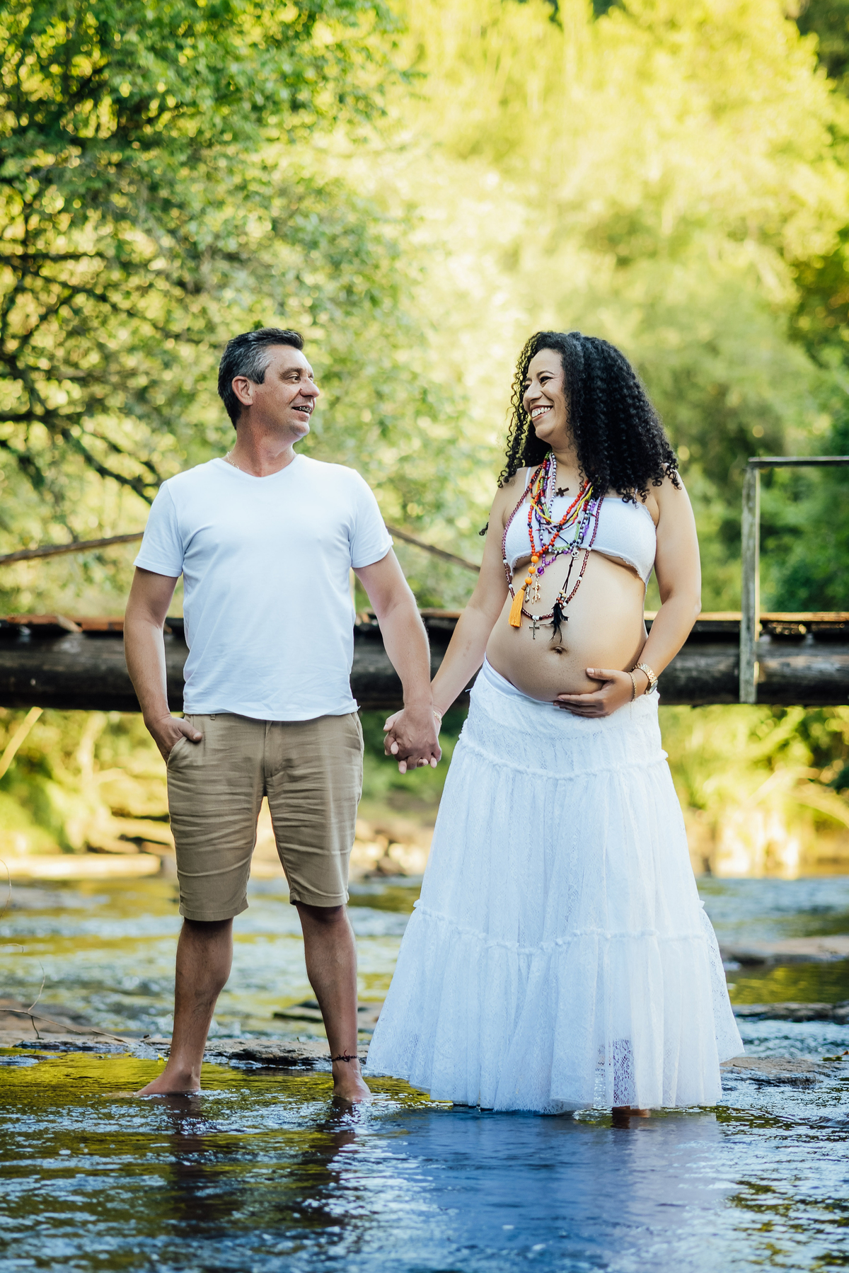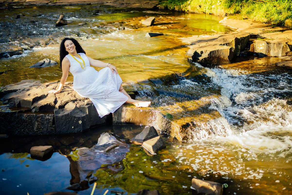 Durante o ensaio, especialmente nas fotos externas, eles trouxeram elementos das suas crenças e daquilo que representa sua fé. Isso transformou tudo em algo ainda mais significativo, porque não eram apenas imagens de uma gestação, eram símbolos de uma história construída com confiança, espiritualidade e amor.