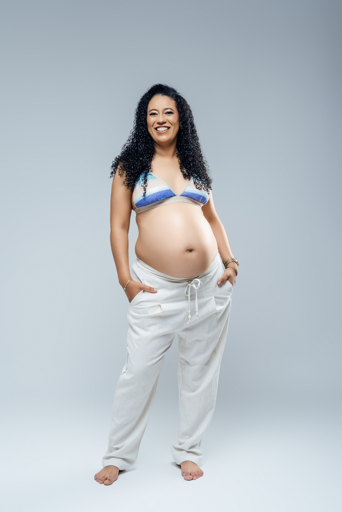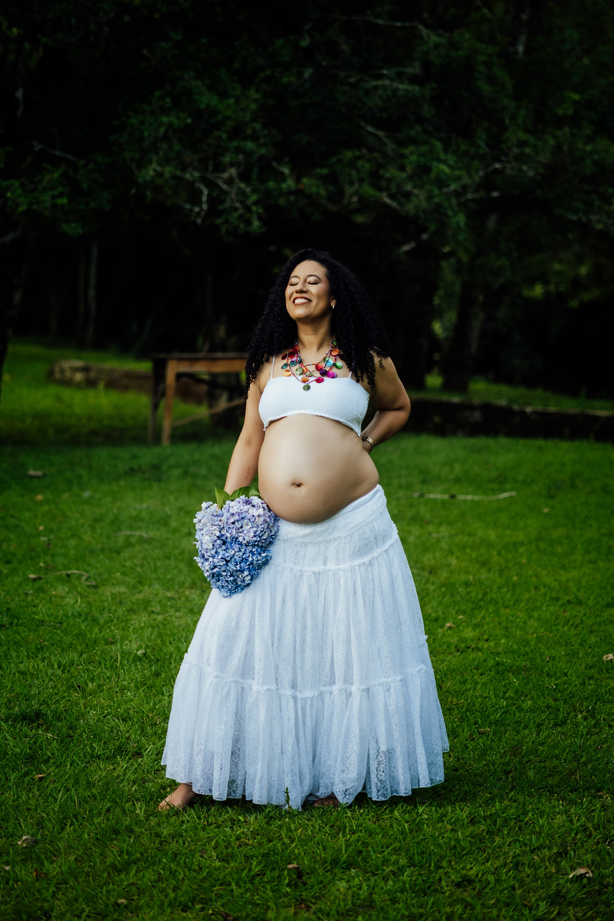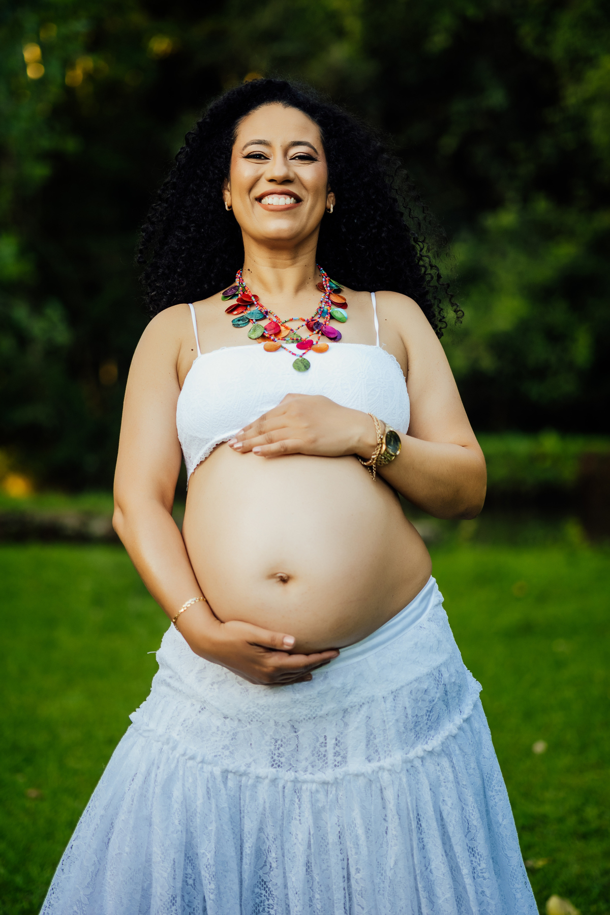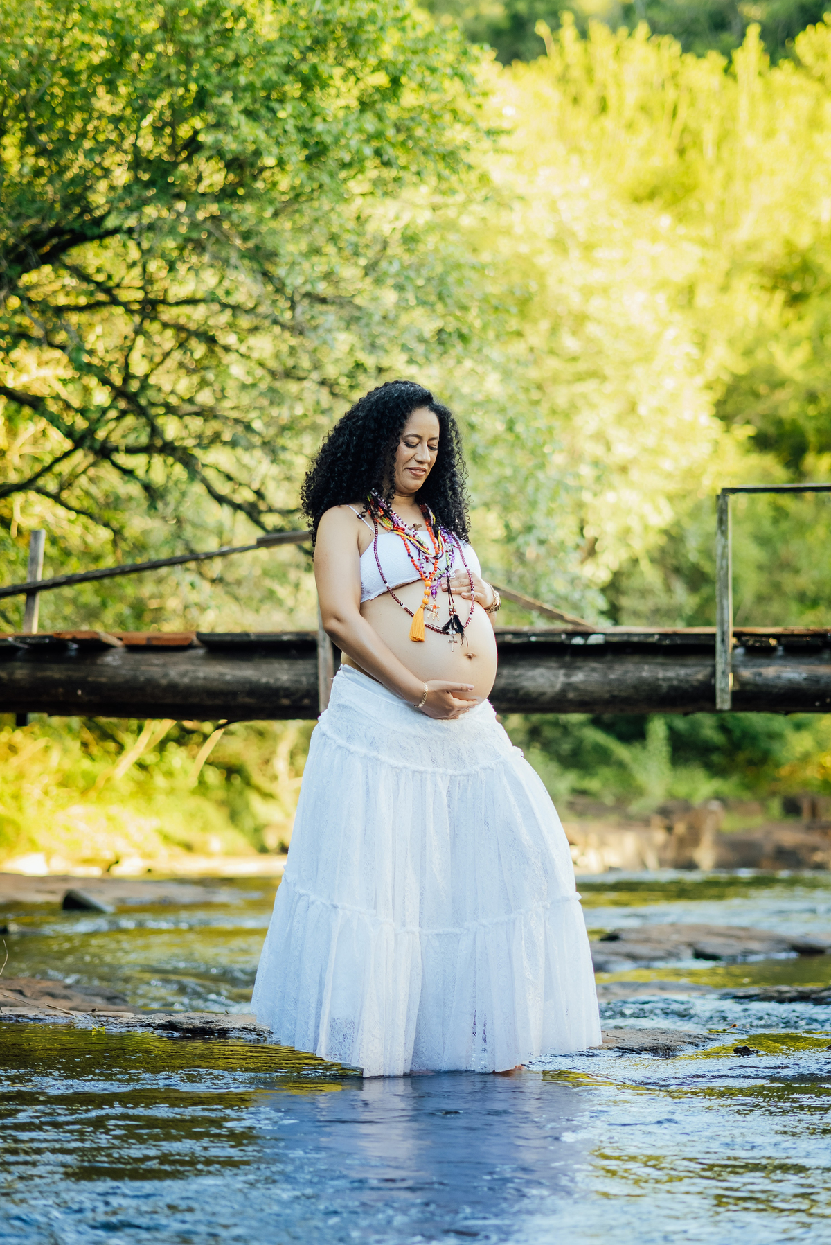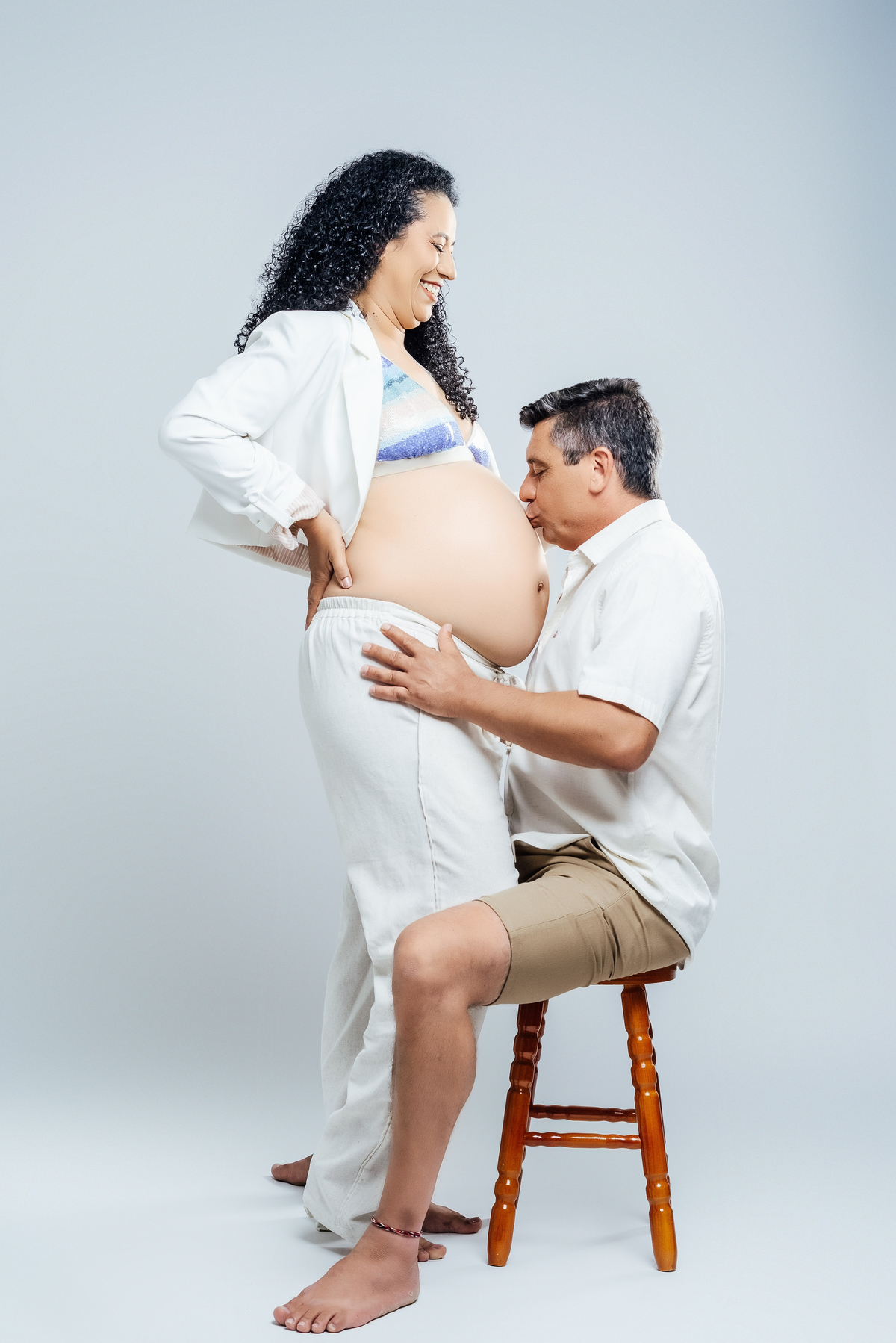 Durante o ensaio, especialmente nas fotos externas, eles trouxeram elementos das suas crenças e daquilo que representa sua fé. Isso transformou tudo em algo ainda mais significativo, porque não eram apenas imagens de uma gestação, eram símbolos de uma história construída com confiança, espiritualidade e amor.