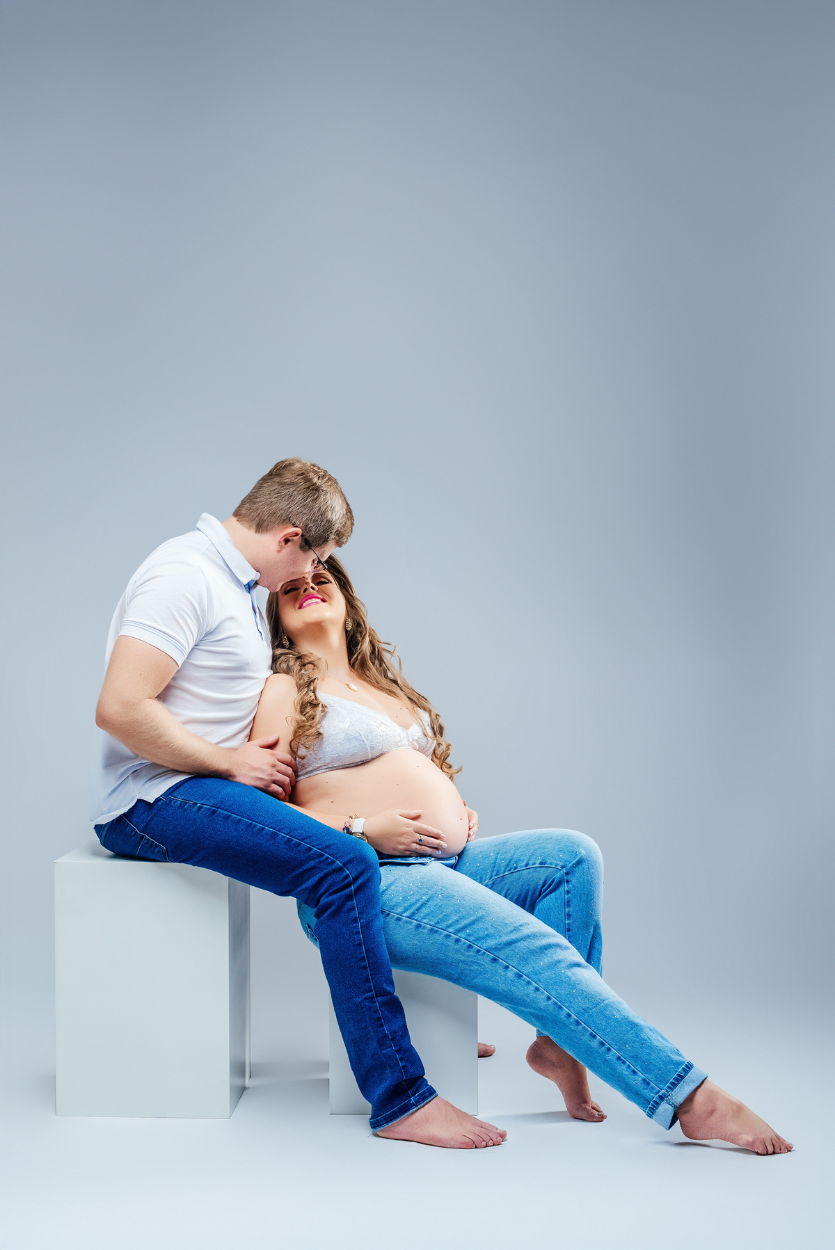 Começamos no estúdio, com uma proposta mais clássica, onde a elegância da Sabrina apareceu de forma natural, com aquela beleza tranquila de quem está vivendo um dos momentos mais especiais da vida.
