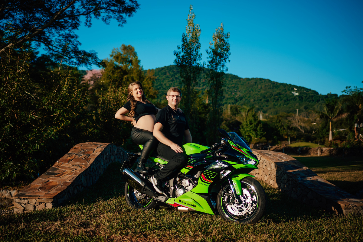 A moto, que faz parte da história do casal, trouxe essa pegada rock’n’roll que combinou perfeitamente com a personalidade dos dois.