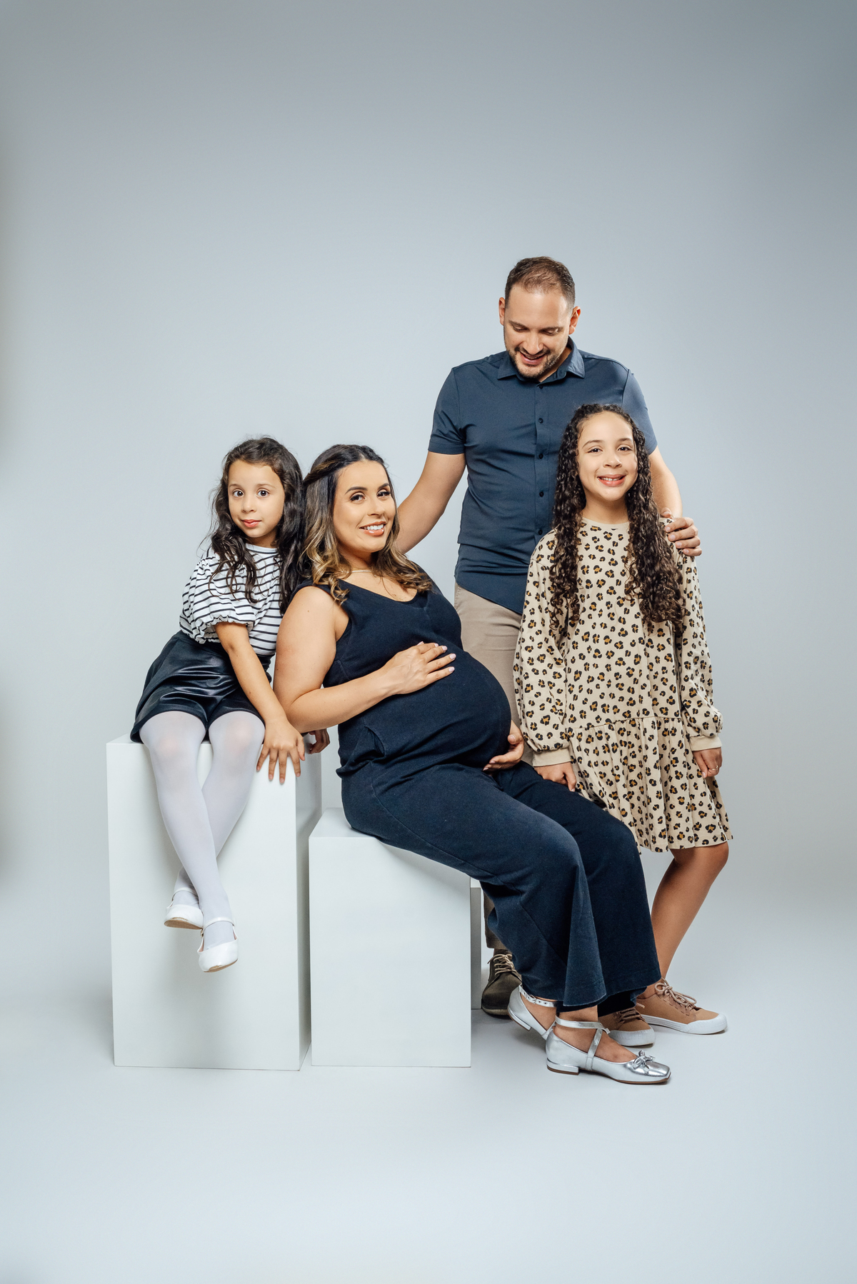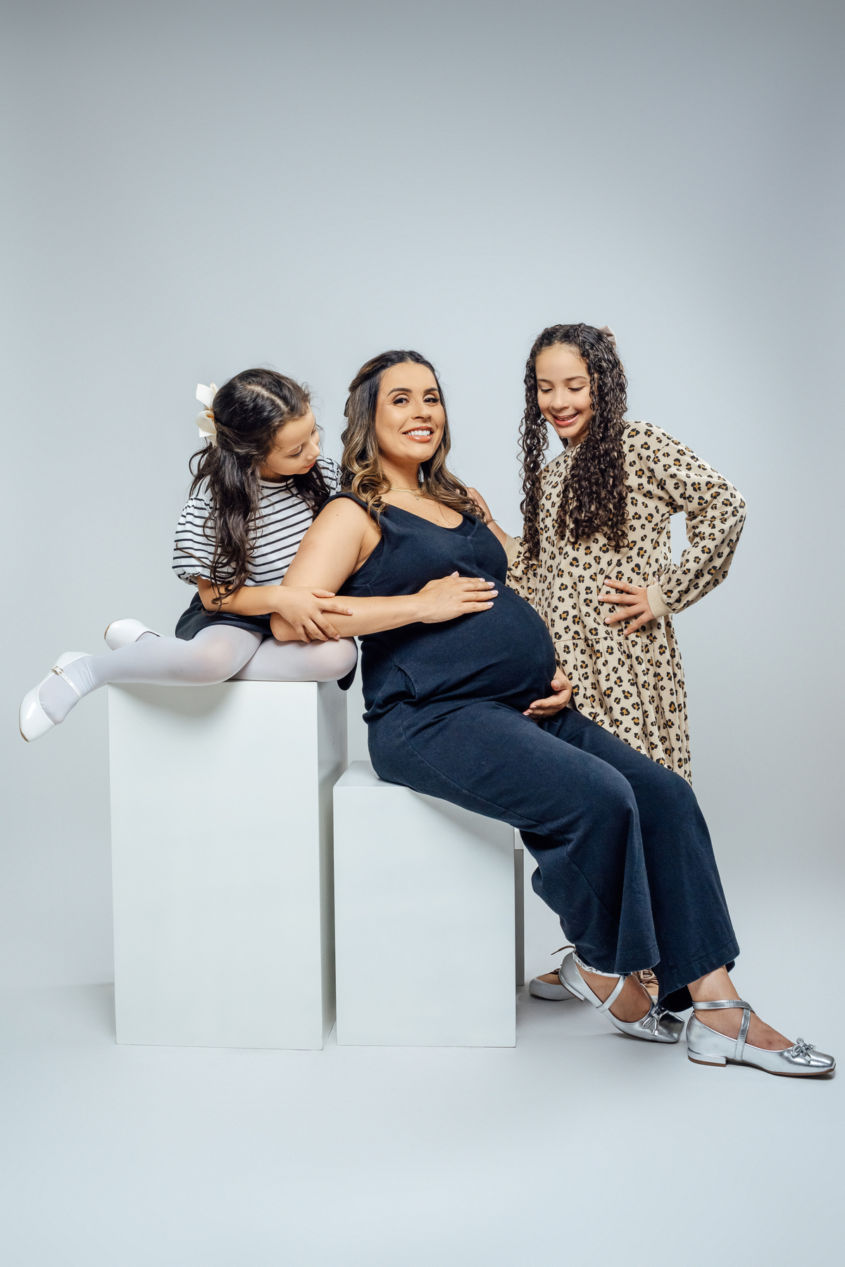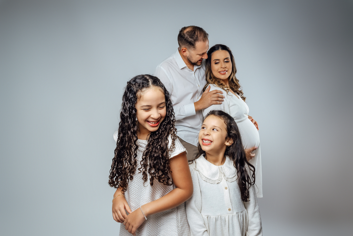 As duas irmãs mais velhas trouxeram ainda mais vida para o ensaio, com aquele carinho cheio de curiosidade e expectativa pela chegada do irmão.